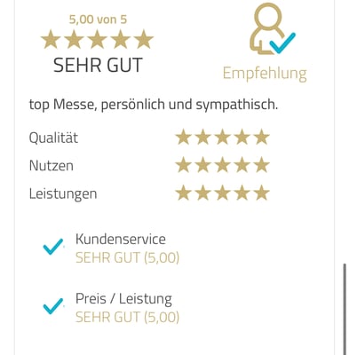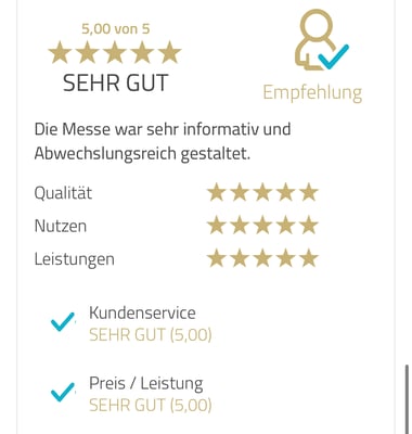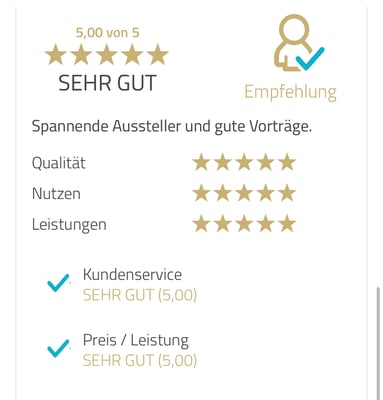Unsere Messe wurde bei einer Kundenumfrage mit "Sehr gut" bewertet. Sowohl Aussteller als auch Besucher hatten einen hohen Nutzen und schätzten die Qualität der Messe. Das Preis / Leistungsverhältnis für Aussteller wurde mit der Höchstnote (5 Sterne) bewertet. Besucher geniessen bei uns kostenlosen Eintritt. Wir freuen uns sehr über dieses grossartige Resultat.